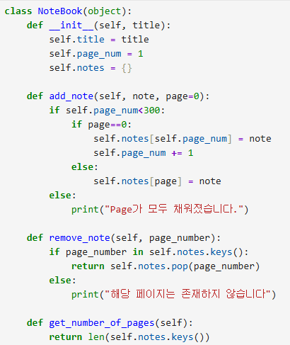 이조은T8159 2025.08.17 신고 new_note1과 new_note2를 추가하고 나서print(my_notebook.notes[1]) 을 했는데 에러가 뜬다면아래와 같이 코드를 수정해보세요..! 수정할 부분은 add_note 메소드입니다.28분 31초에 보이는 NoteBook 클래스가 실습에 사용하시는 코드일 거에요! 연관 강의 [4. 파이썬 기초 문법 III] Python Object Oriented Programming 공유하기 URL복사 밴드 페이스북 트위터 추천 my_notebook 실습 중 print(my_notebook.notes[1]) 에서 에러가 발생한다면 - 이조은T8159 my_notebook 실습 중 print(my_notebook.notes[1]) 에서 에러가 발생한다면 - 이조은T8159 1.2배속도 있으면 좋겠어요... 미니콘다 맥북 설치가 되지 않을 때 목록 댓글 comment 최신순 등록순 추천순 나의 글만 보기 OFF 페이지 이동 First Prev Next Last